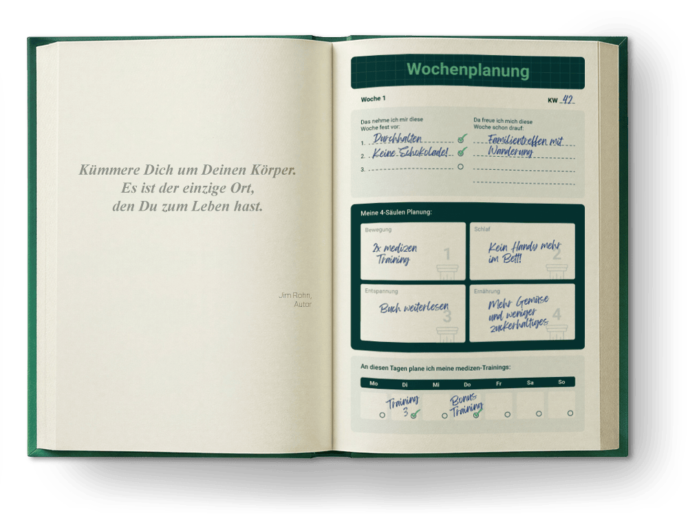 Buche bis zum 07.01. und wir schicken Dir GRATIS per Post den medizen Transformations-Planer zu. Der Planer führt Dich durch die 4 Lebenssäulen für mehr Bewegung, besseren Schlaf, ausgewogene Ernährung und tiefgehende Entspannung.