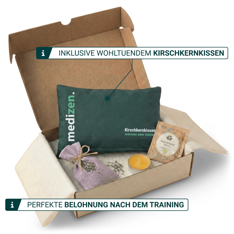 Buche bis zum 21.03. und wir schicken Dir GRATIS per Post die medizen Wellness-Box inkl. wohltuendem Kirschkern-Kissen zur Entspannung Deiner Muskulatur. Die perfekte Belohnung nach jedem Training.